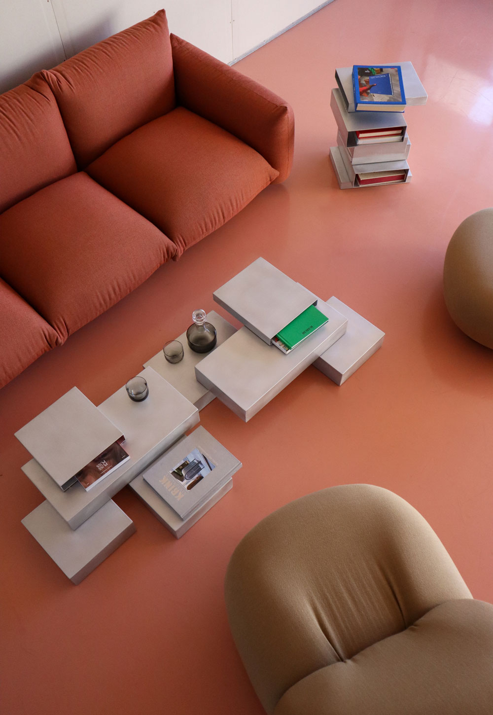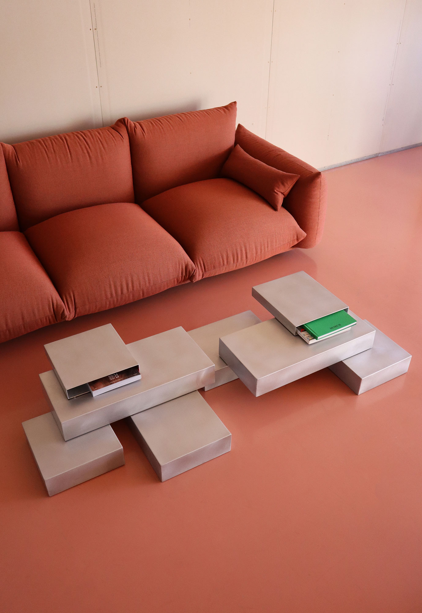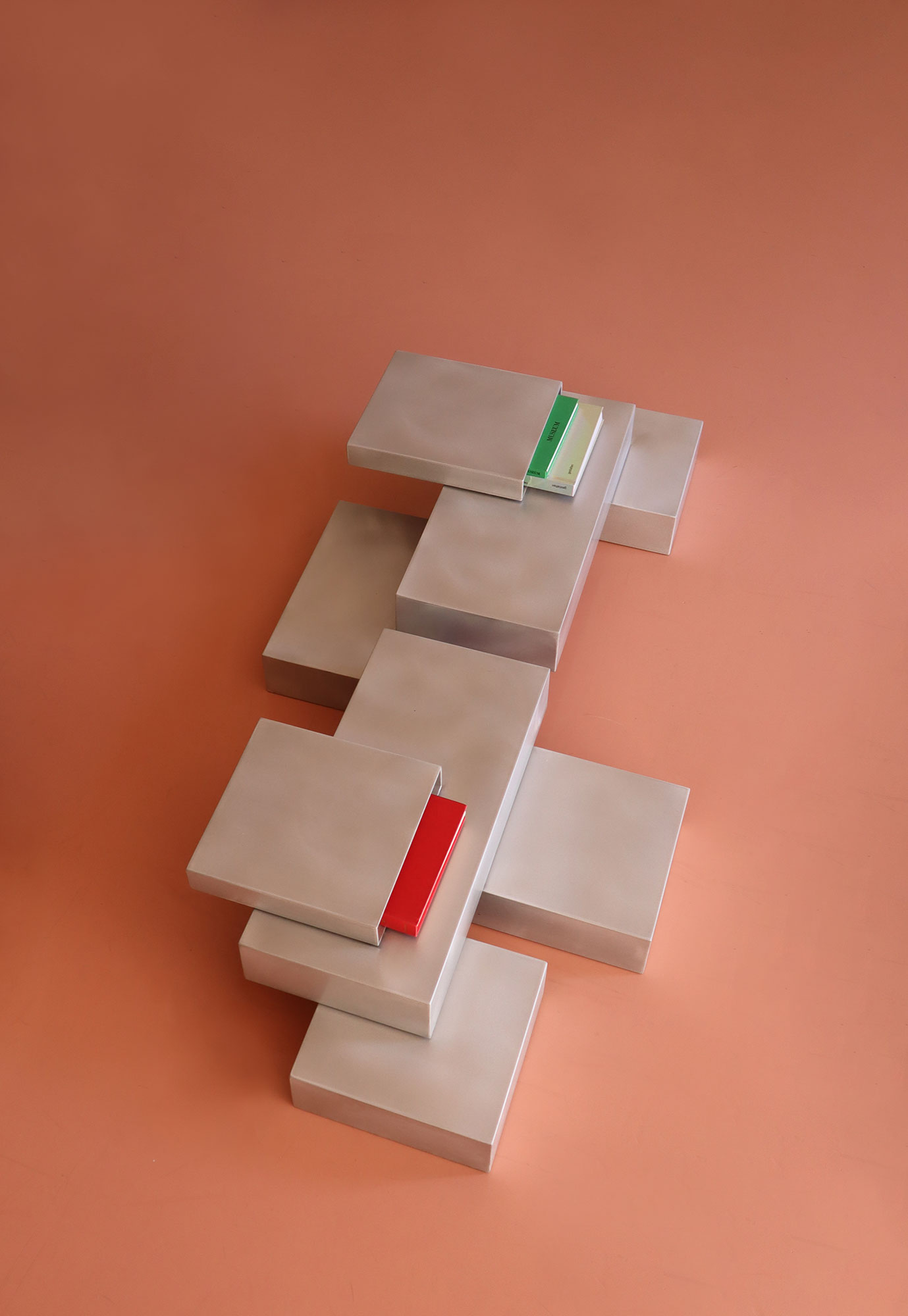 Constructed from stacked aluminum blocks, the table features two open sides at the upper levels, functioning as book pockets. The blocks are fabricated into two sections, allowing them to be used separately or joined together to form a single continuous stacked of blocks.