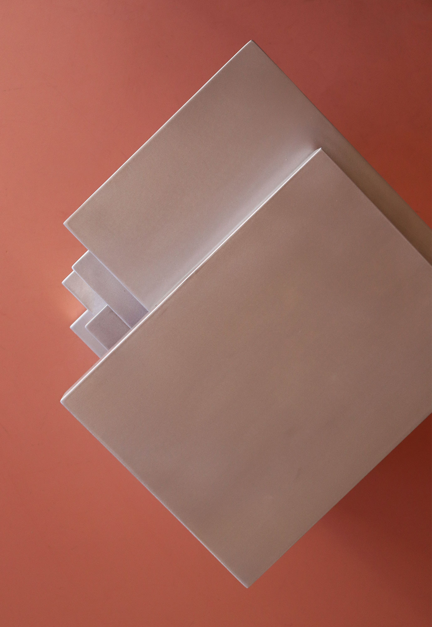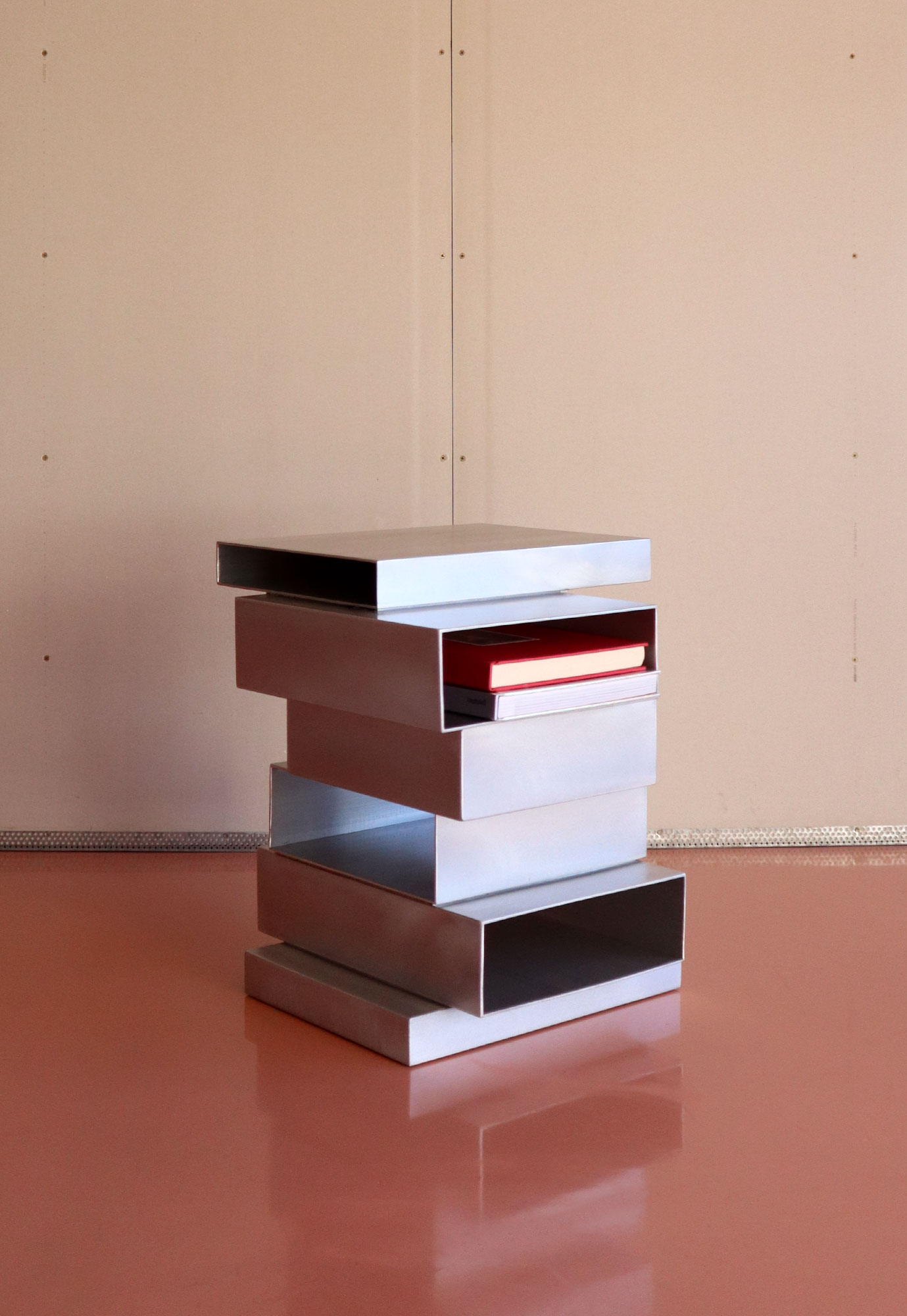 Constructed from stacked aluminum, the side table translates the architectural language of the collection into a compact, vertical form. Open sides positioned on different faces and levels function as integrated book or object pockets. Fabricated fully as a standalone piece, designed to add an architectural art approach to any to any collection.