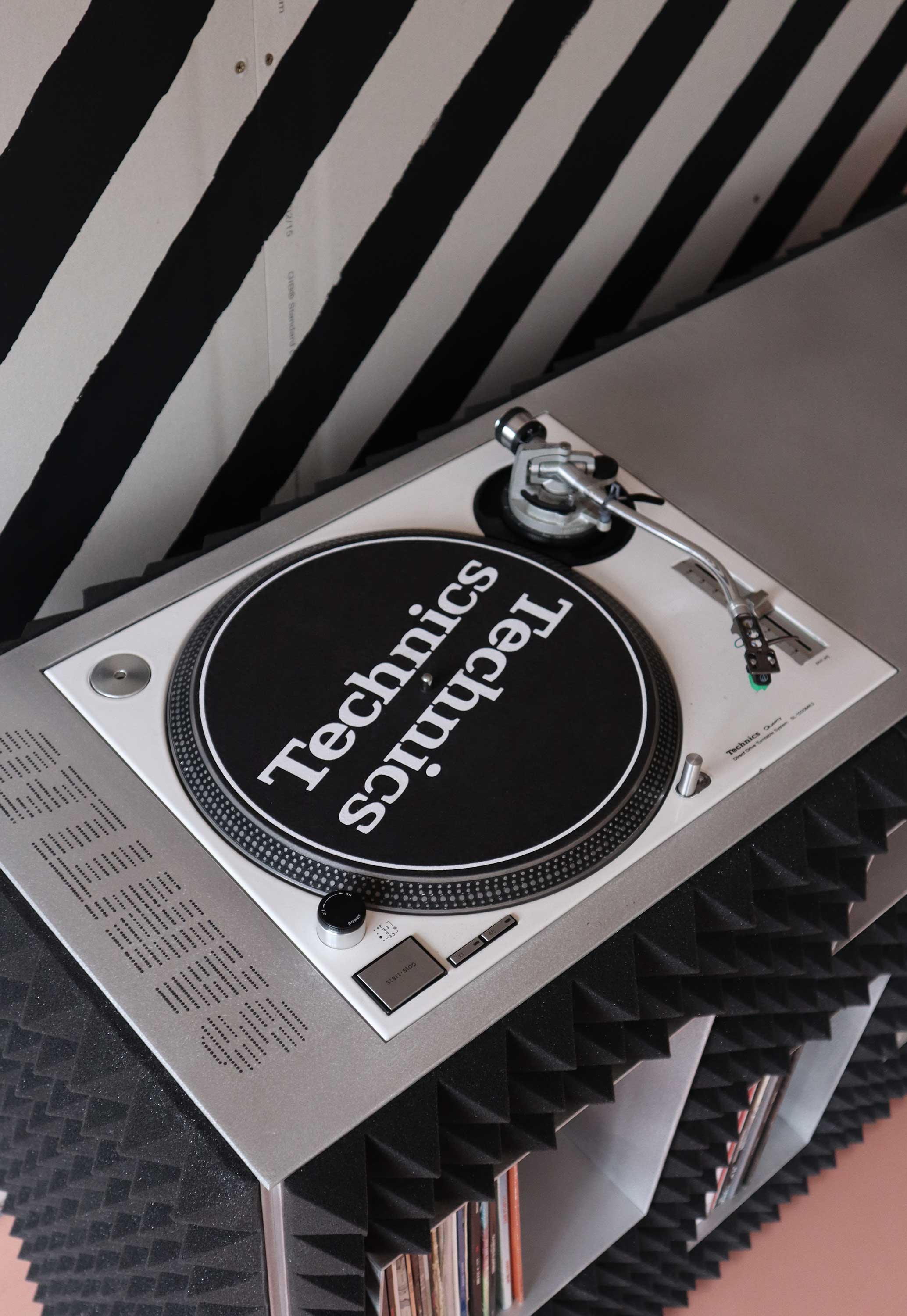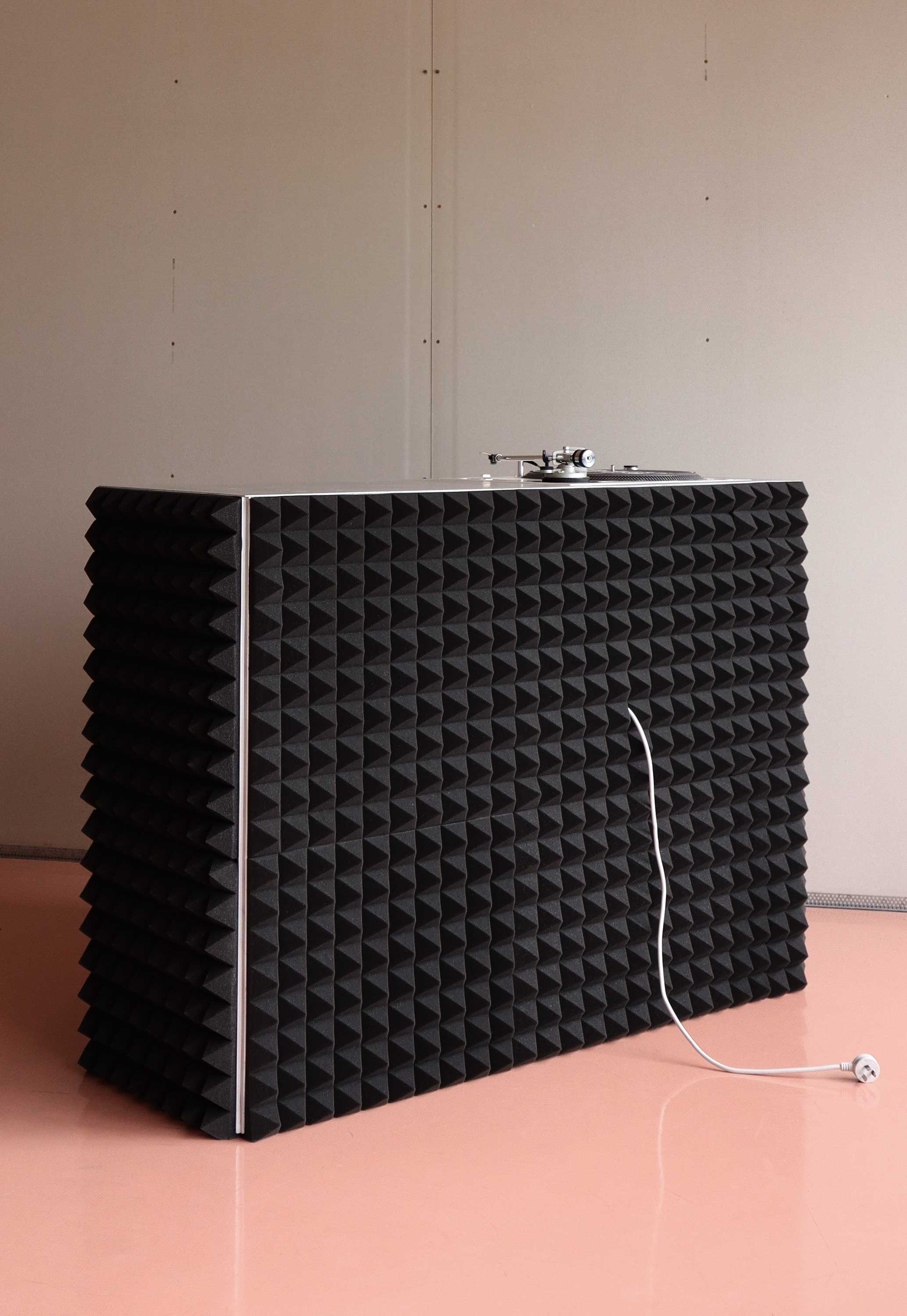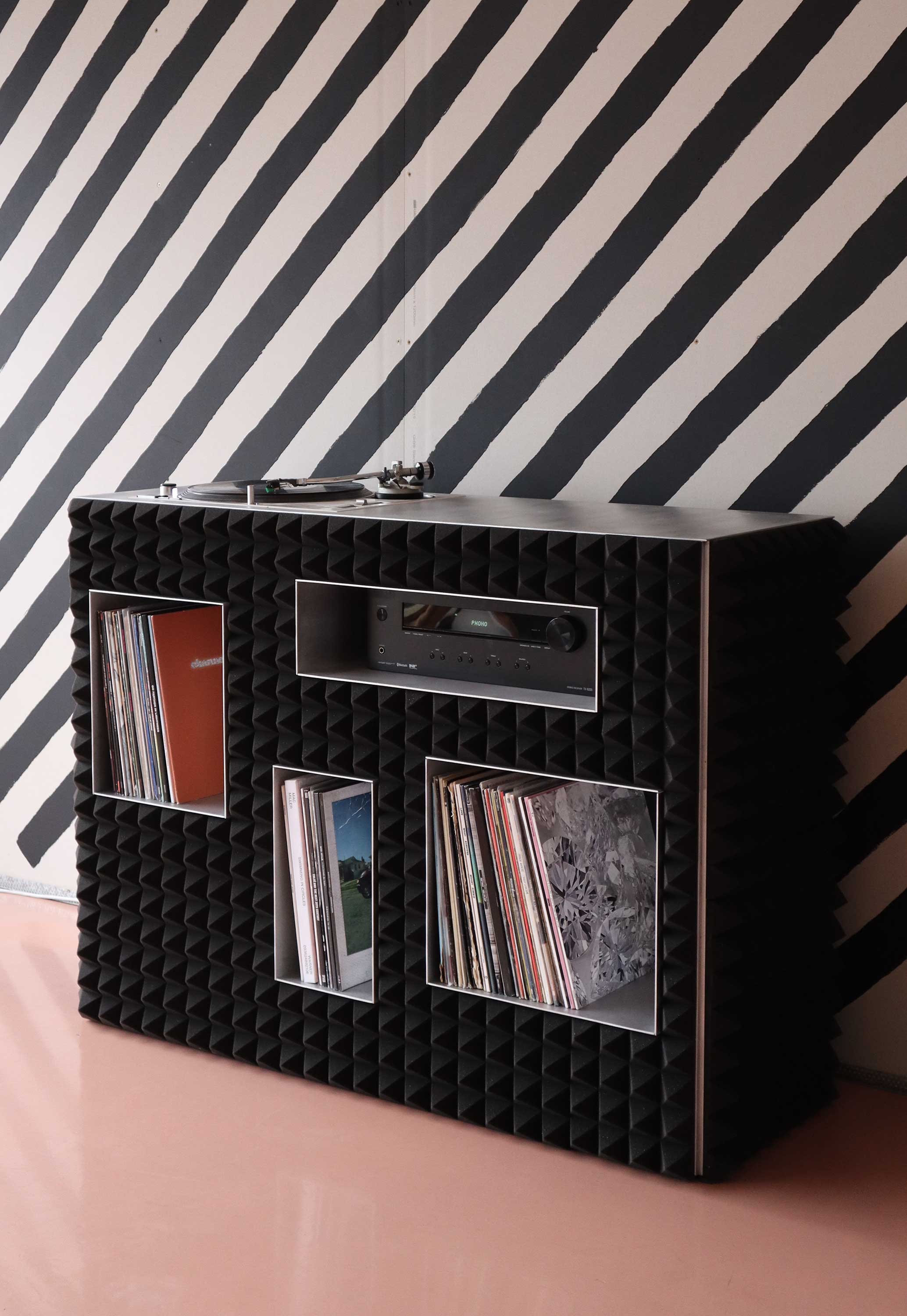 This personal vinyl unit draws inspiration from pyramid acoustic foam sound booths, reinterpreted through furniture-scale form. The piece incorporates a built-in Technics 1200 turntable opening, amplifier housing, and vinyl storage arranged in varied sizes and irregular placement, creating a dynamic and non-uniform composition.