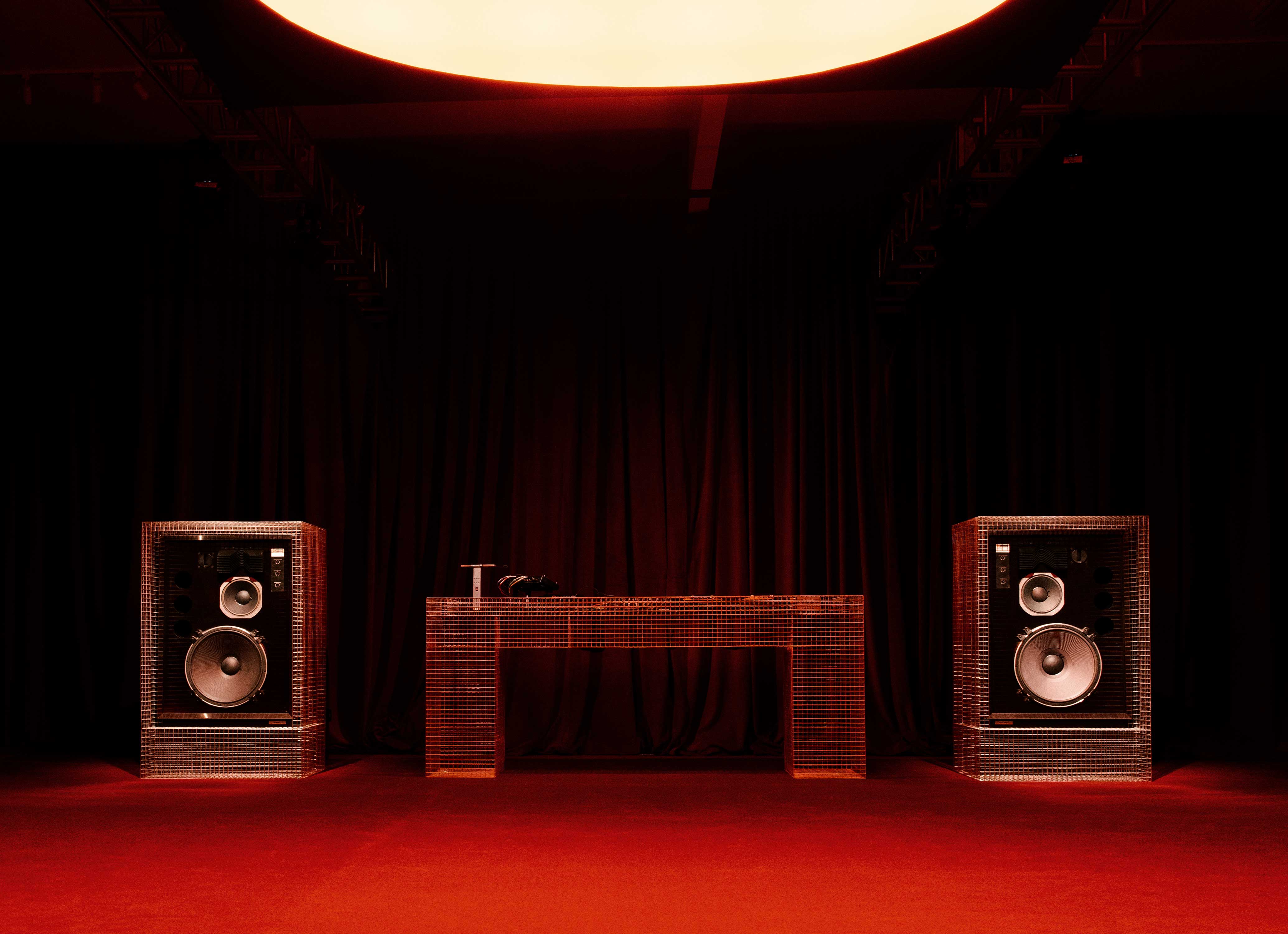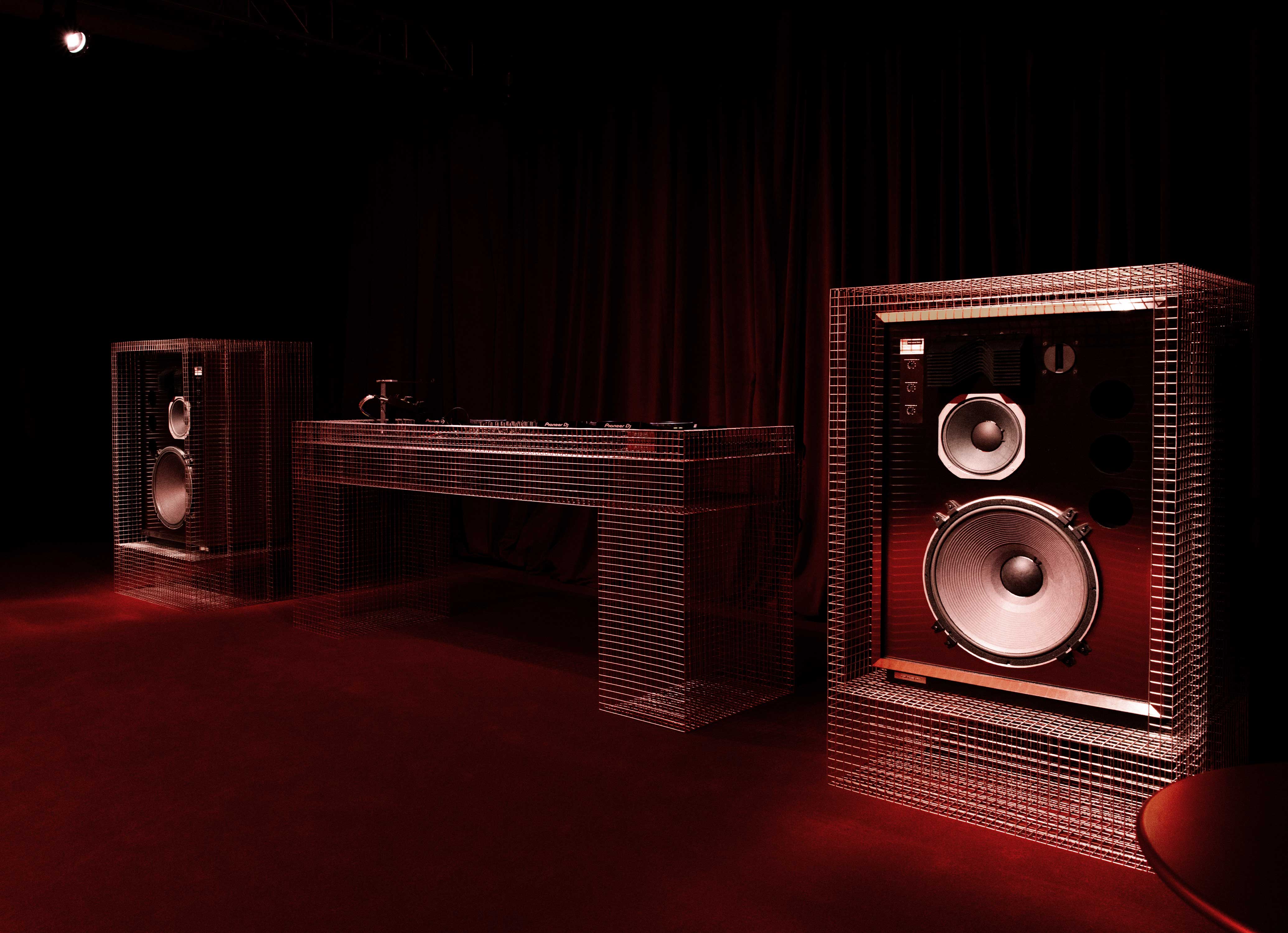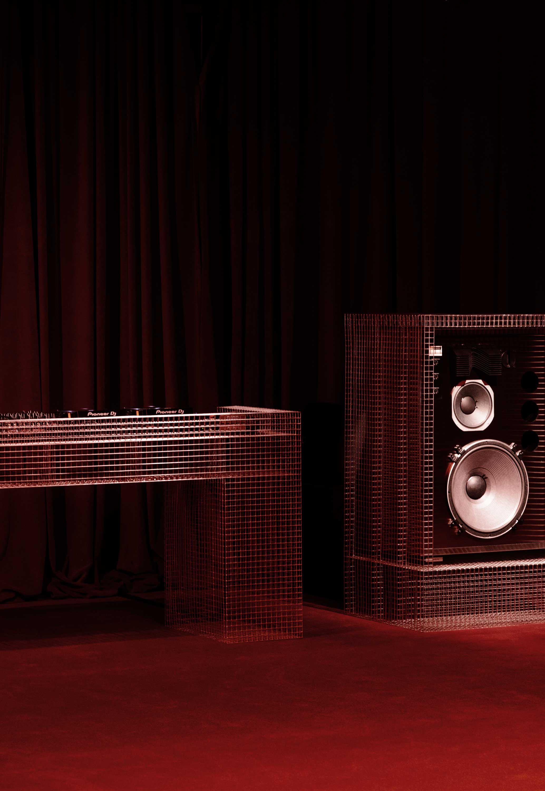 The speakers were set into individually fabricated stainless steel mesh stands, extending the material language across the installation and into the DJ booth, which is finished with a polished stainless steel working surface. The material originating as continuous rolls, the mesh was measured, flat-patterned, and cut into sections before each wire was manually stitched together. Through assembly alone, the flexible material gained rigidity, transforming into a structural form.