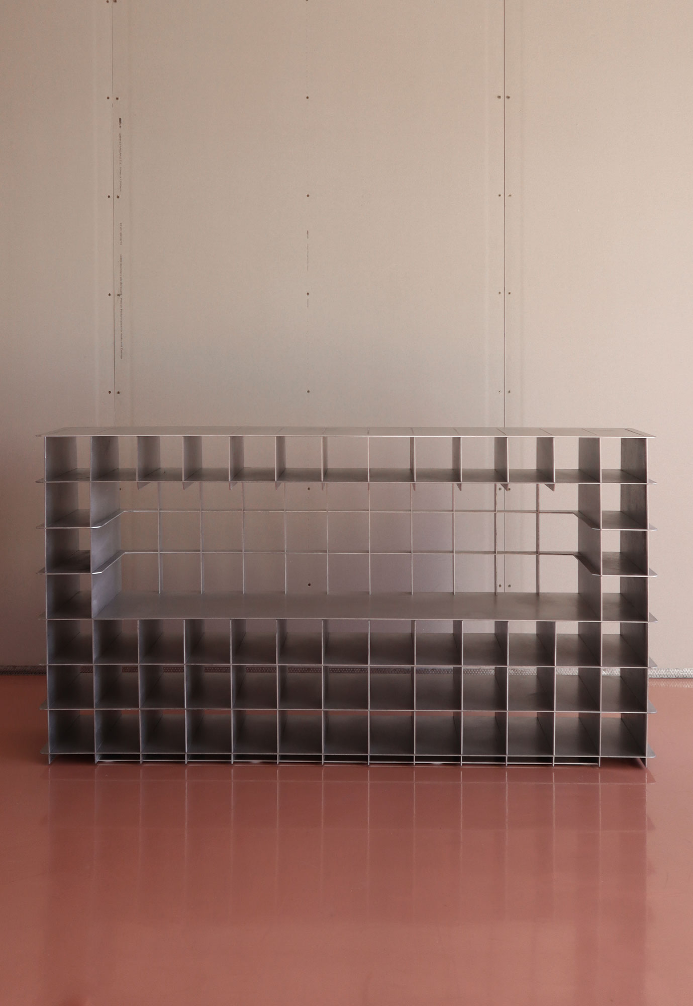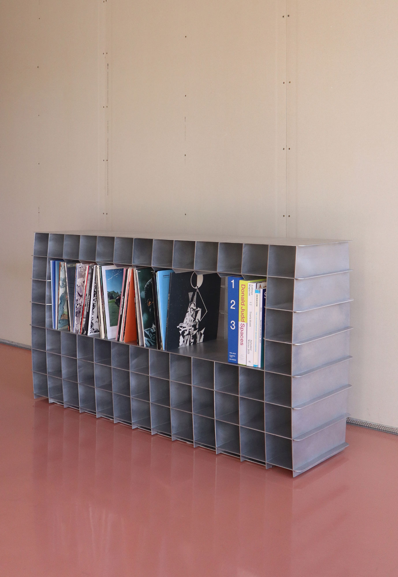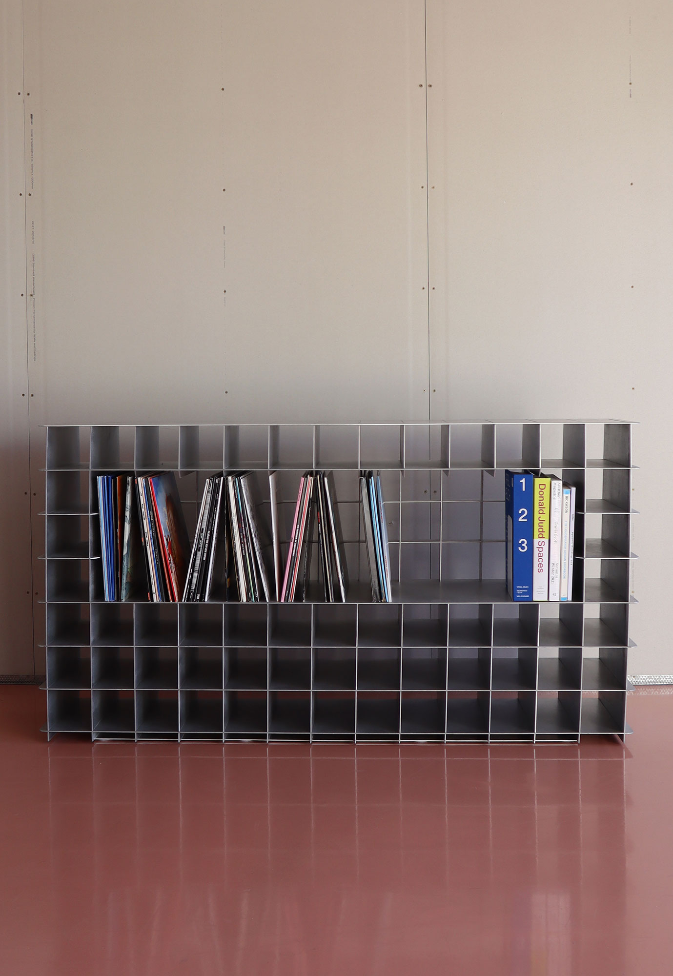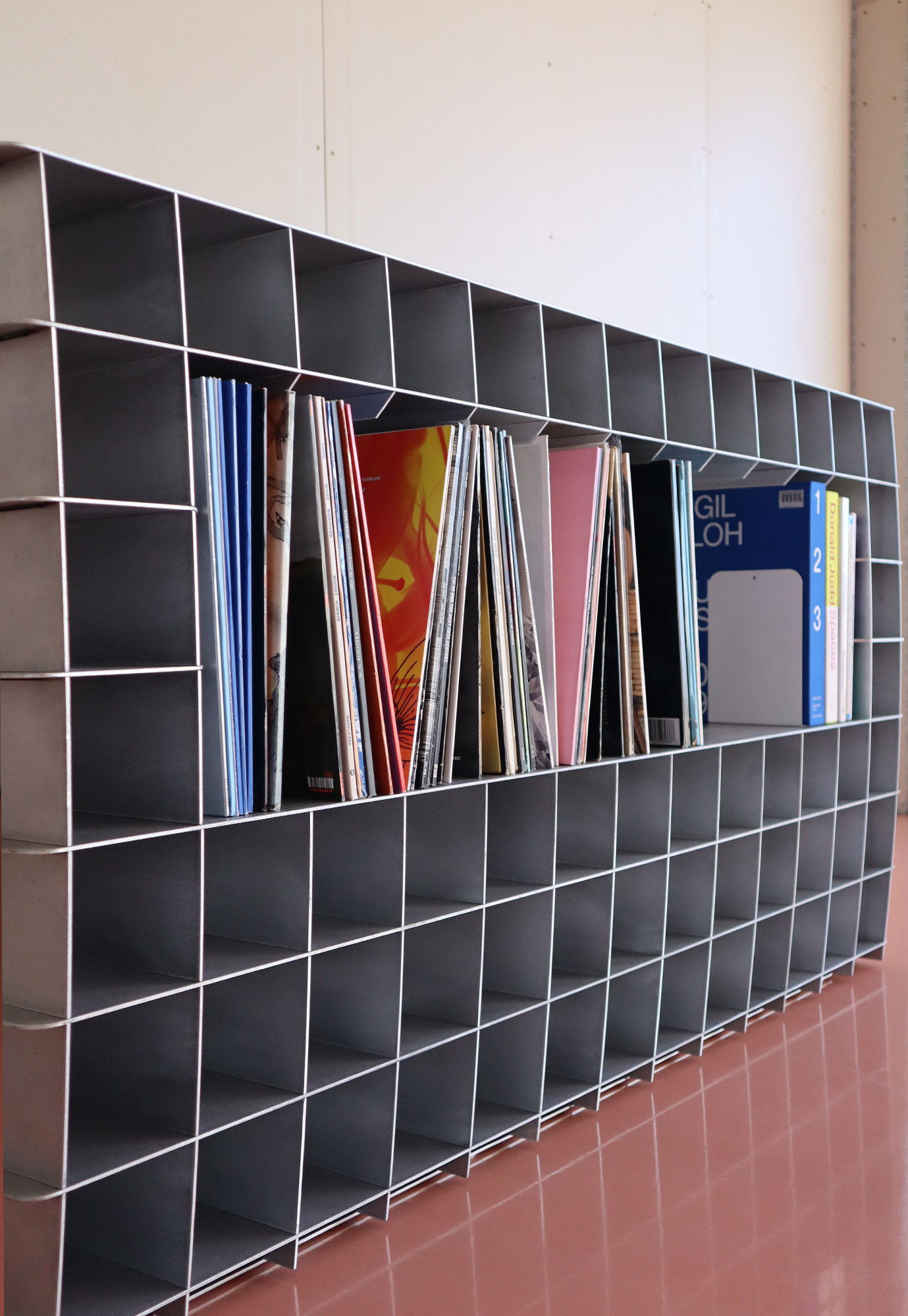 Made in 12-gauge Aluminum with a brushed finish. The horn unit is precision-designed using CAD software. The design files were converted to DXF format and then transferred to a laser cutter, ensuring accurate cutting and perfect fitting without the need for additional fasteners. Inspired by multicell horn speakers, the unit’s center section features individual compartments, ideal for displaying vinyl records, books and Amps