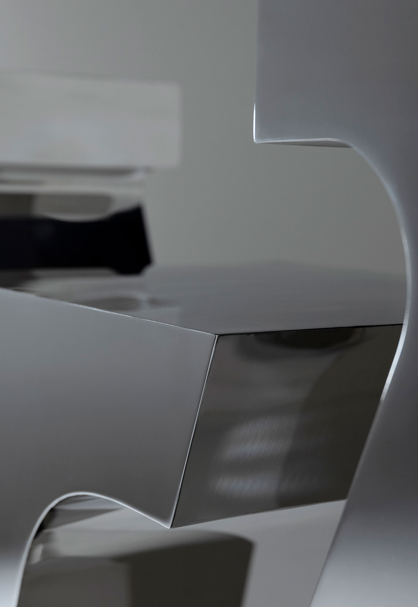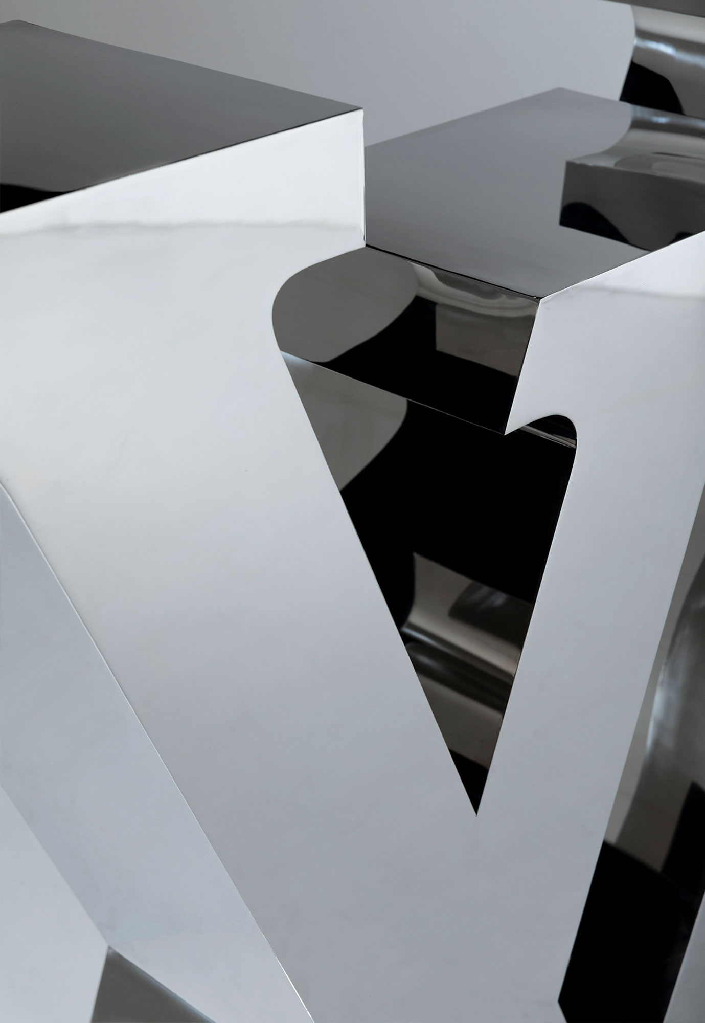 The form originates from laser-cut front and rear logo planes, joined by hand-fabricated walls that are TIG welded, sanded, and polished to create seamless transitions and uninterrupted edges. The entire piece is finished by hand, allowing the surface to achieve a mirror-like clarity that reflects its surroundings and amplifies material depth.
