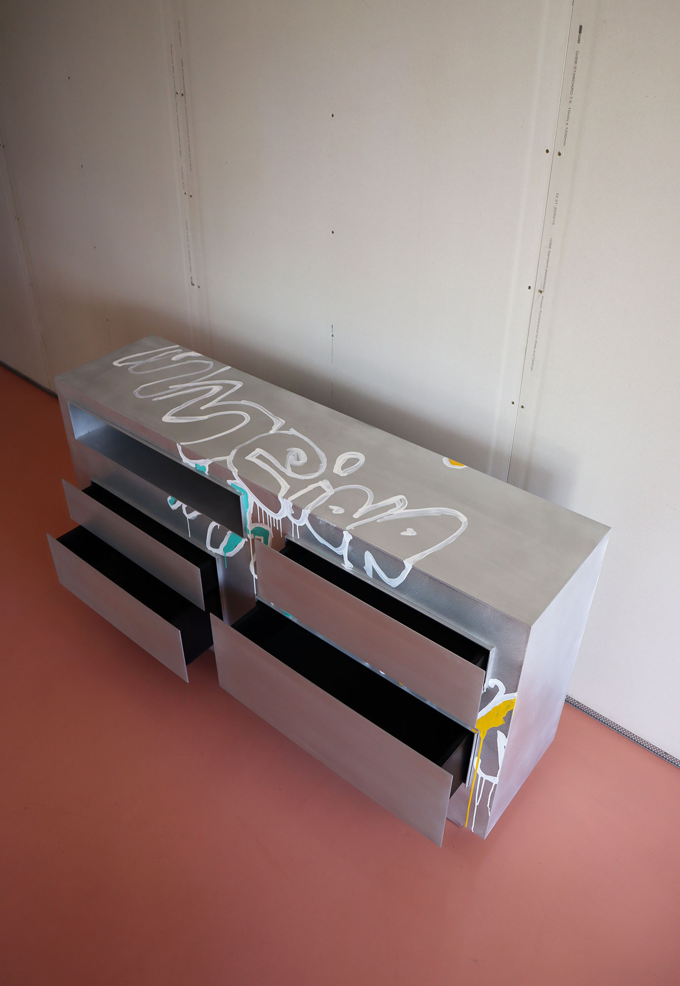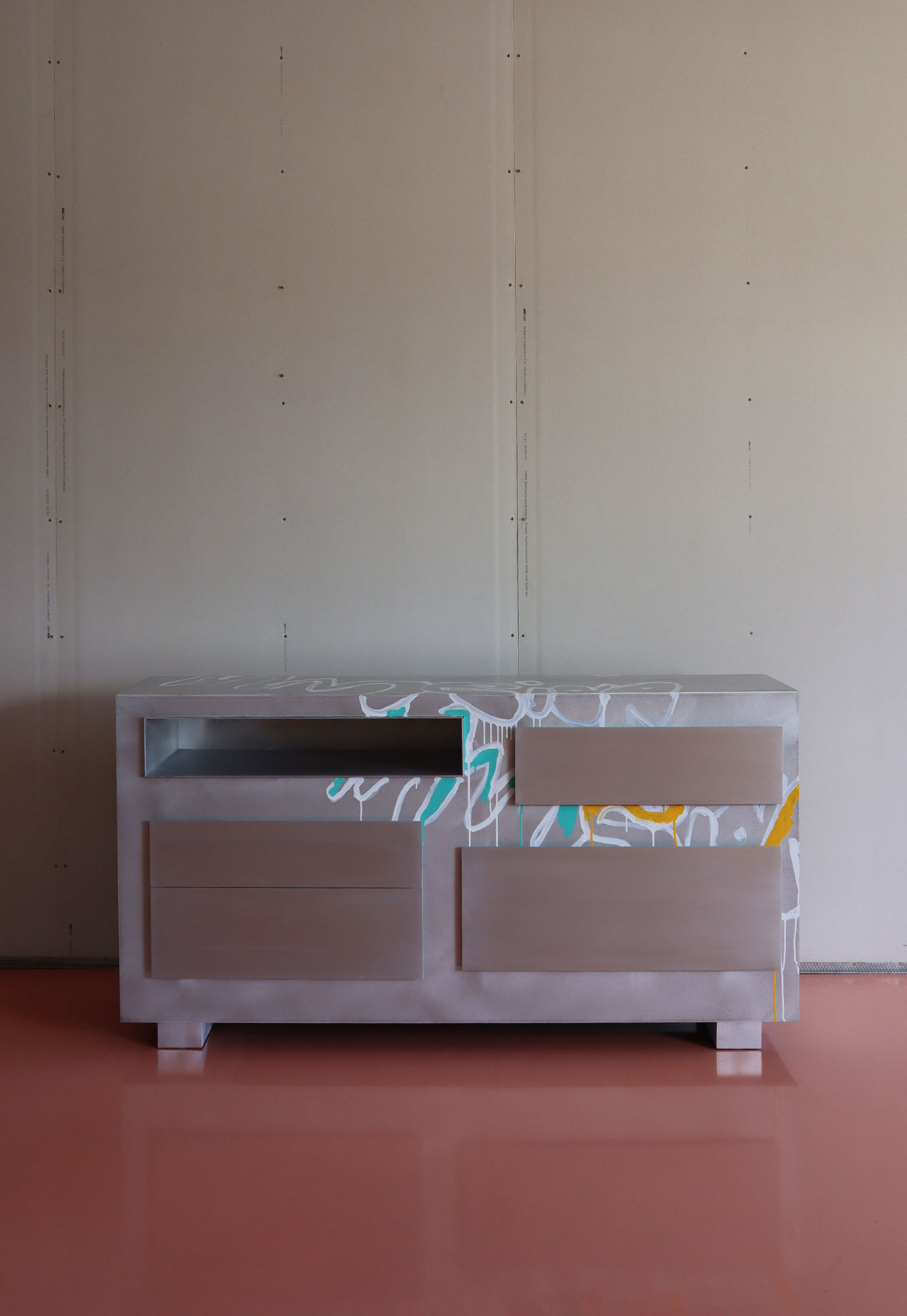 A collaboration piece for Meide (Studio) the lowboy features four (soft close) drawers and a open section. The drawers are packed off the face of the unit enabling a handless design as space surrounds the drawers. The unit features graphics by Meide (Studio) applied by Krink Markers NYC