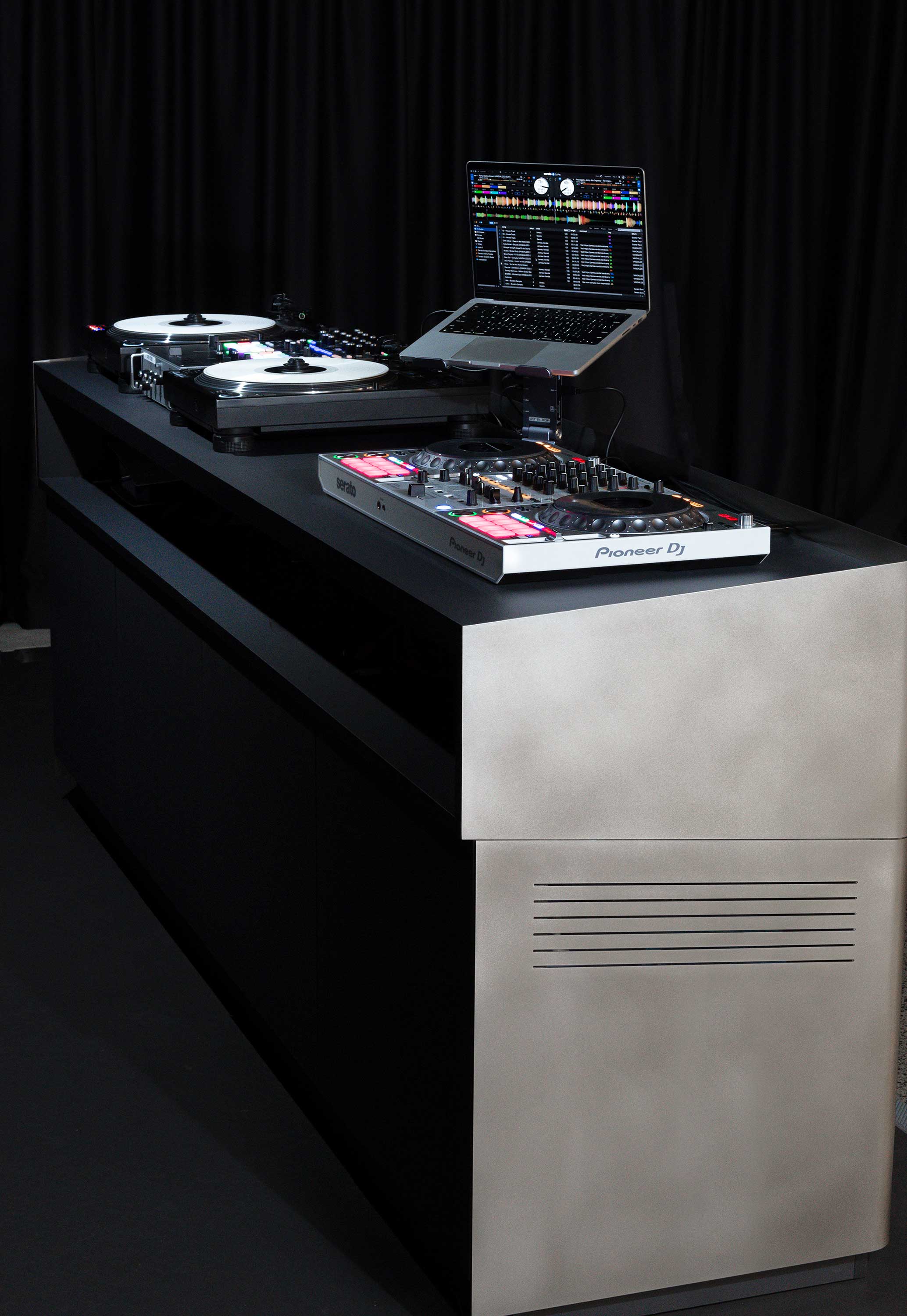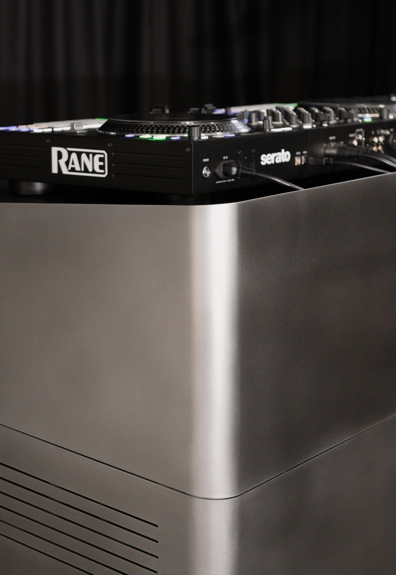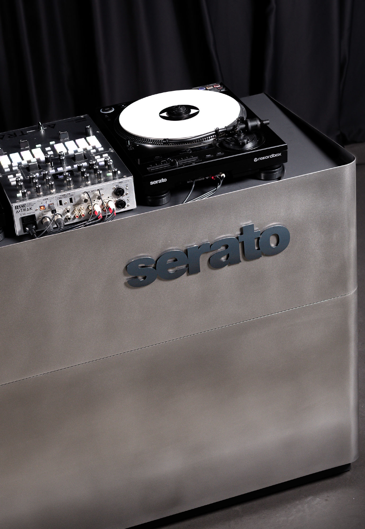 Designed in collaboration with Serato , this exclusive DJ booth balances presence and restraint. Constructed internally from black furniture-grade plywood. The form incorporates an open controller space and five integrated storage cabinets with discreet cable routing through-out producing a continuous, monolithic presence.
