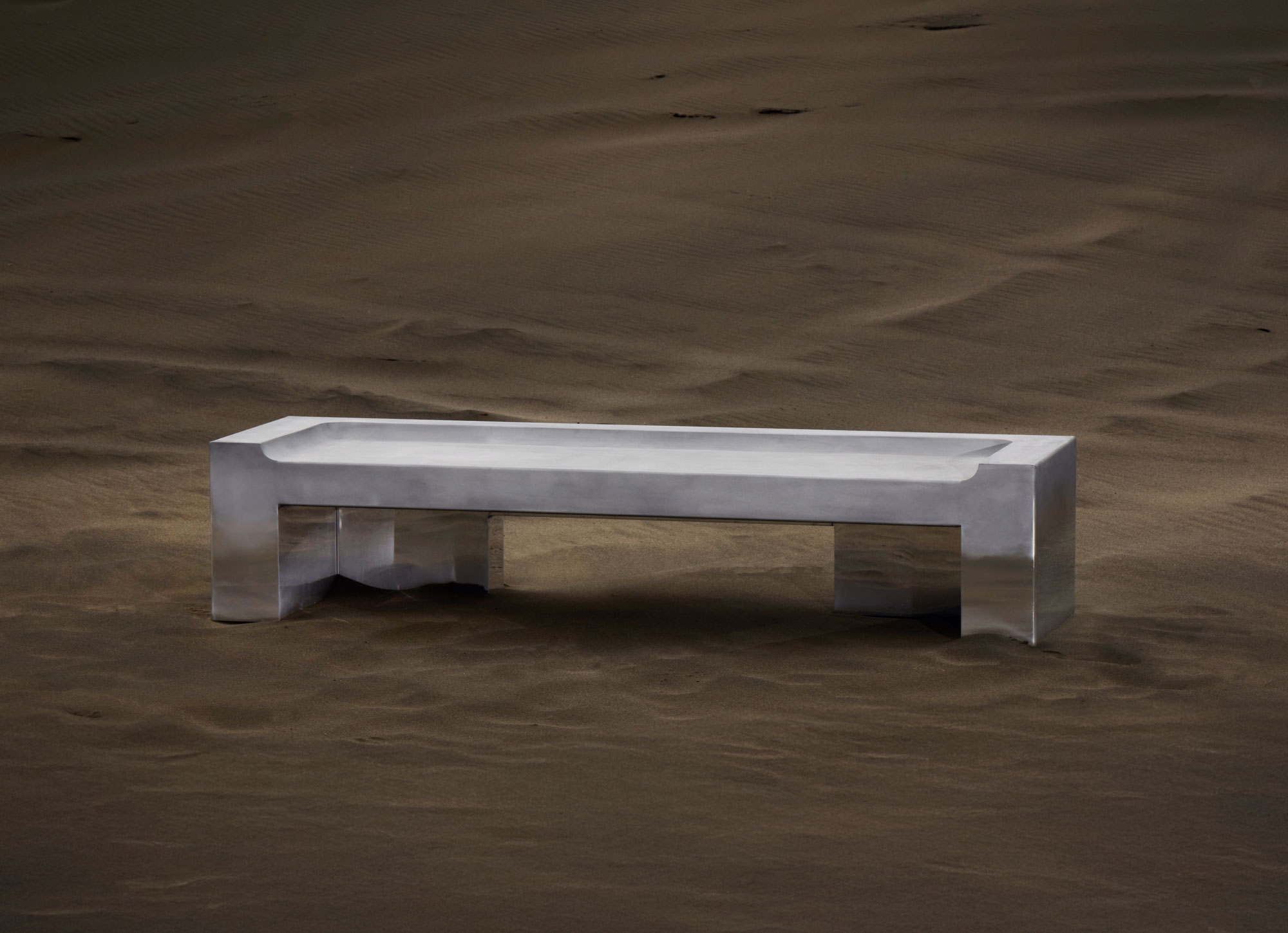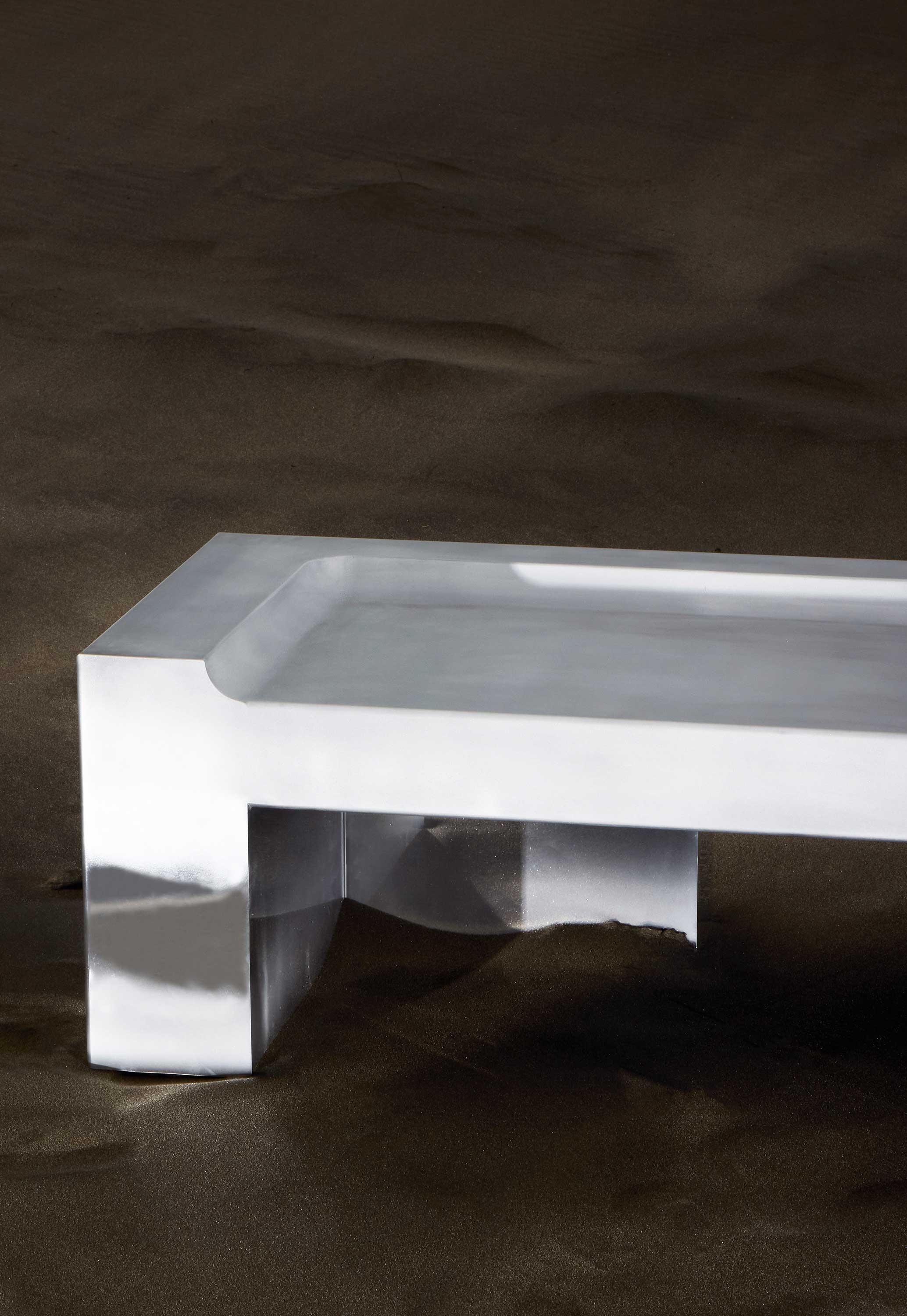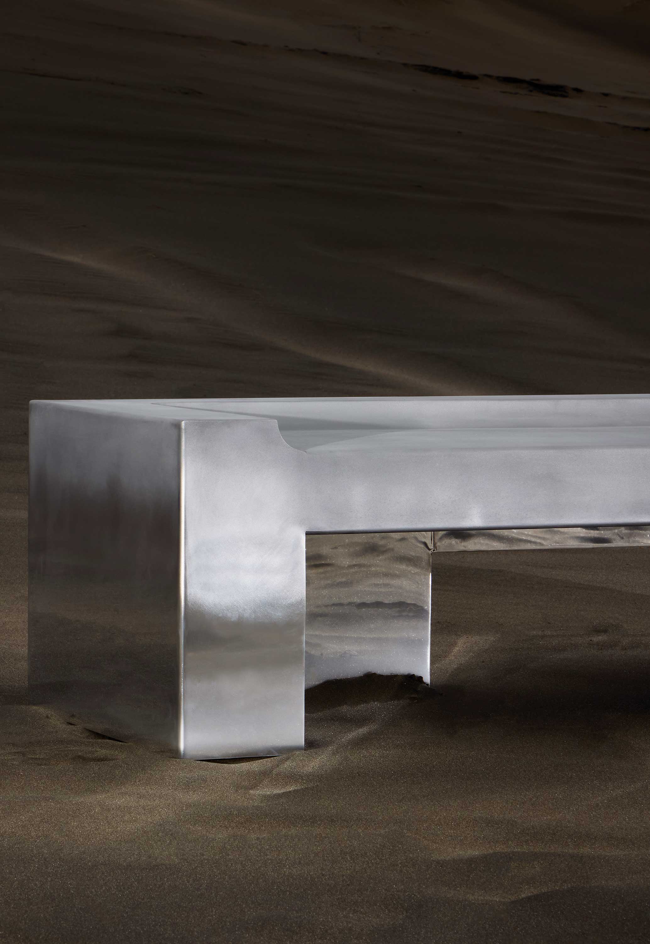 Fabricated entirely from aluminum, the bench features an ombré transition: a sandblasted upper surface gives way to a mirror-polished lower half. The matte top is intended for longevity through use, while the reflective base visually dissolves into its environment, mirroring surrounding light and architecture rather than competing with it.